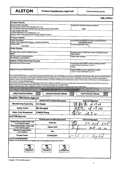 2008年我公司為ALSTOM提供的汽缸螺栓通過了FPR(完全放行文件)、并且成為國內唯一一家ALSTOM授予